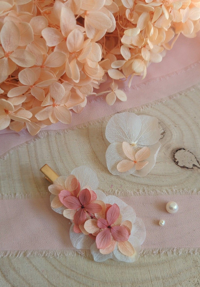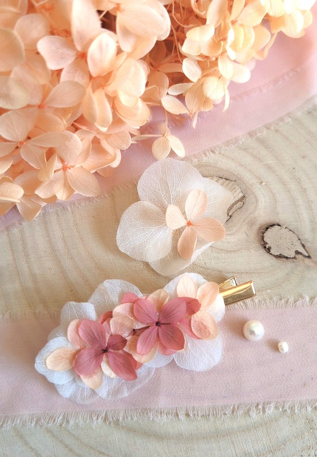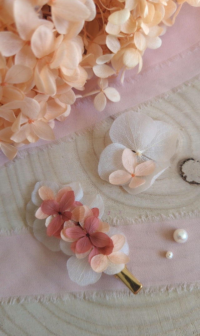 🌸 Ornée de véritables fleurs d’hortensia et gypsophile pastels