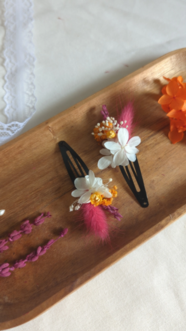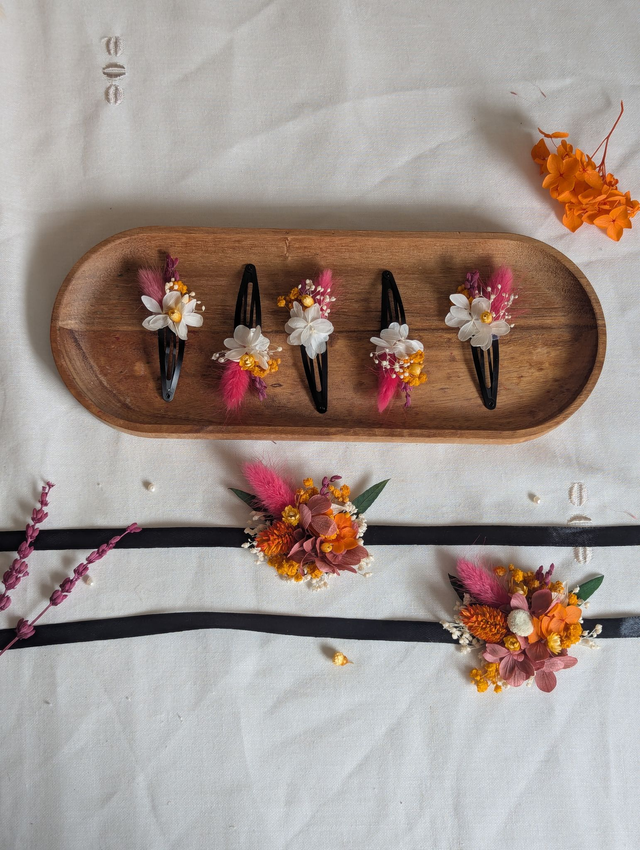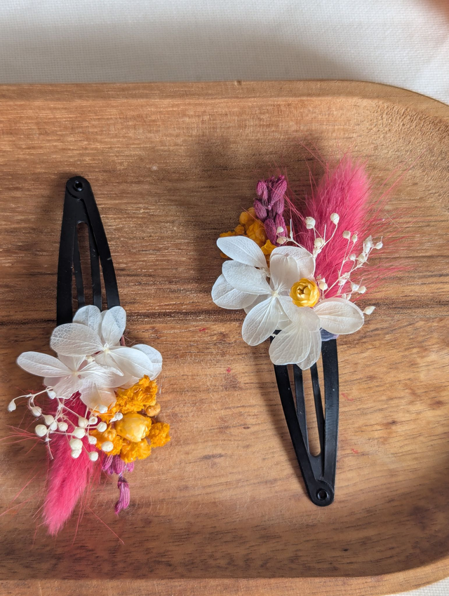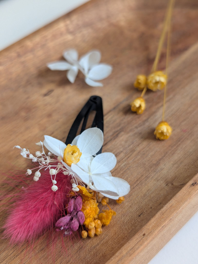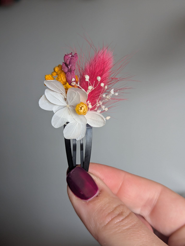 Ajoutez une touche florale, colorée et bohème à votre coiffure grâce à cette barrette en fleurs séchées, pensée pour votre cortège de mariage. Chaque pièce est minutieusement confectionnée à la main, avec des fleurs séchées et stabilisées.