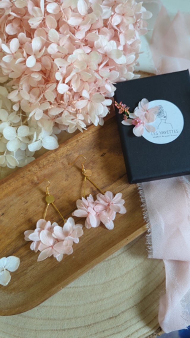 Ces boucles d’oreilles fleuries en hortensia séché et stabilisé sont la touche parfaite pour celles qui aiment les bijoux délicats, naturels et faits main. Chaque paire est unique : les fleurs d’hortensia sont soigneusement sélectionnés et assemblés à la main dans mon atelier.