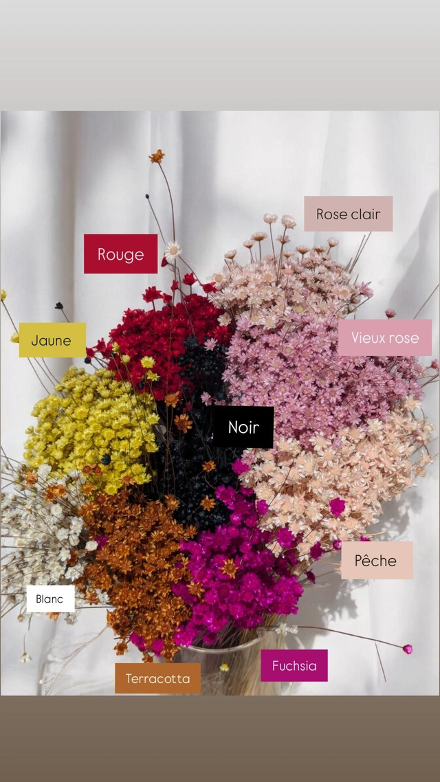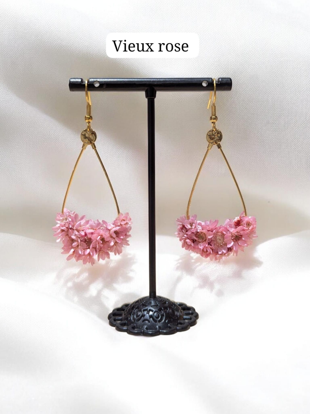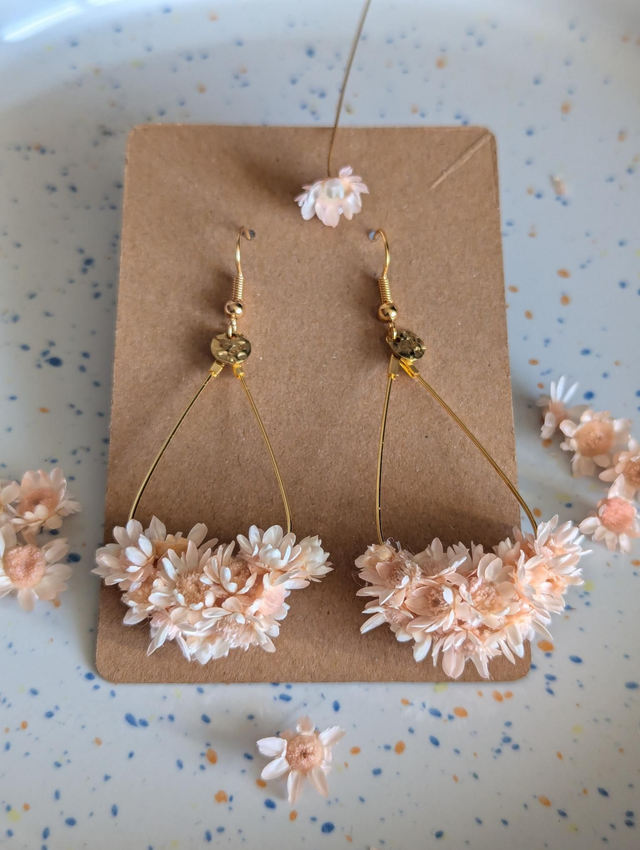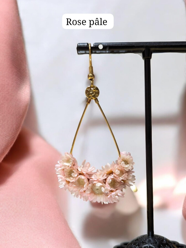 Chaque paire est fabriquée à la main avec soin et passion, alliant des matériaux durables comme l'acier inoxydable et des fleurs stabilisées, qui ne se faneront jamais. Chaque paire peut légèrement varier en fonction des fleurs naturelles, créant un bijou unique à chaque commande 🌷