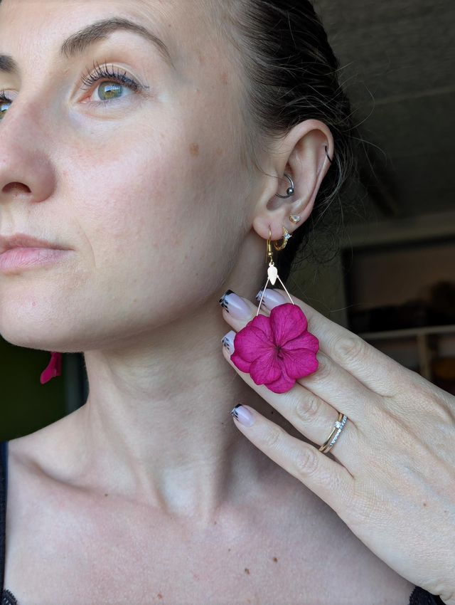 Chaque paire est fabriquée à la main avec soin et passion, alliant des matériaux durables comme l'acier inoxydable et des fleurs stabilisées, qui ne se faneront jamais. Chaque paire peut légèrement varier en fonction des fleurs naturelles, créant un bijou unique à chaque commande 🌷