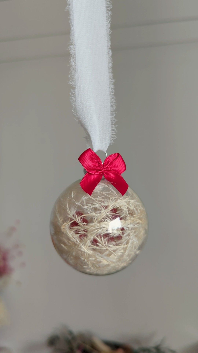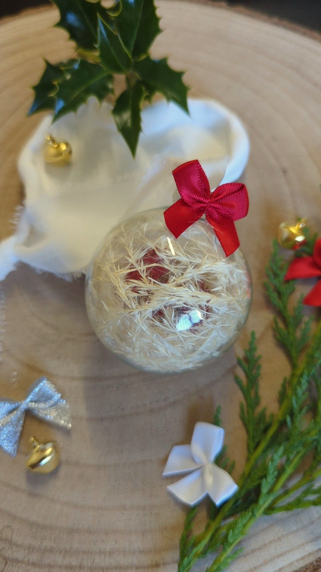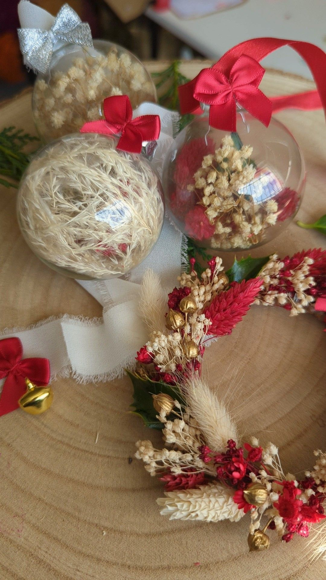 Ces boules transparentes en verre, garnies de fleurs séchées et stabilisées, transforment votre sapin en une véritable œuvre unique. Chaque création est faite à la main, avec des fleurs soigneusement choisies pour refléter l’esprit de Noël : chaleur, authenticité et poésie.