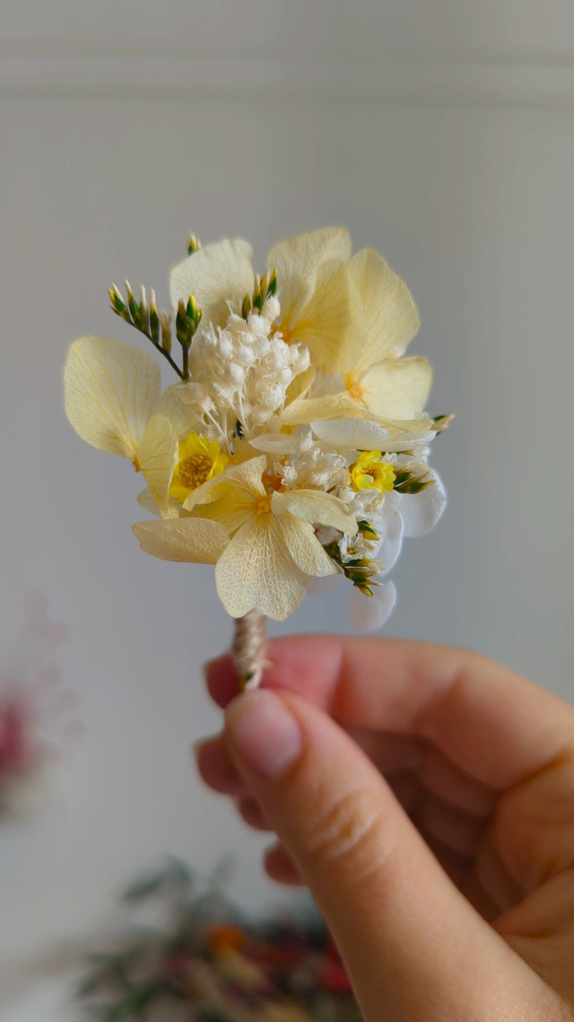 Originale, élégante et pratique : boutonnière avec épingle en fleurs séchées et stabilisées de la collection Lemon Fizz, pensée pour les mariages fleuris !