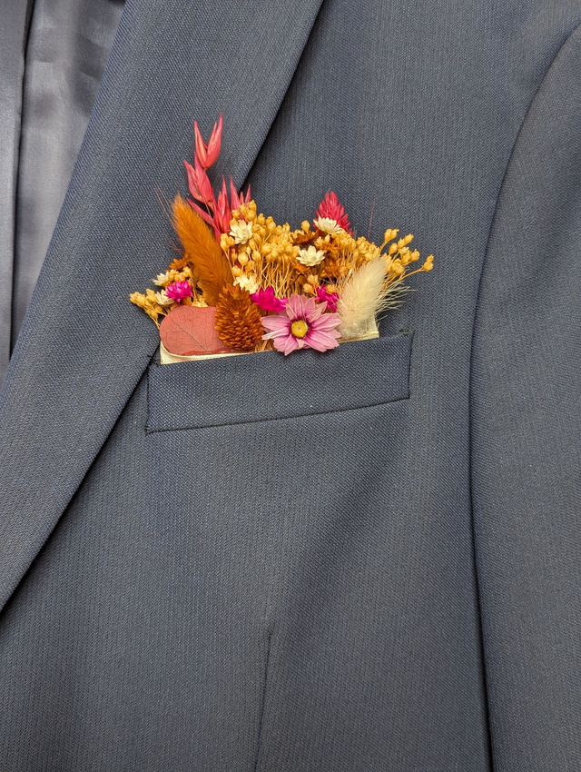 Ajoutez une touche d'élégance intemporelle à la tenue du marié avec cette pochette boutonnière en fleurs séchées et stabilisées. Spécialement conçue pour les costumes, cette pièce unique marie la beauté naturelle des fleurs avec la durabilité pour un souvenir éternel de VOTRE journée spéciale.