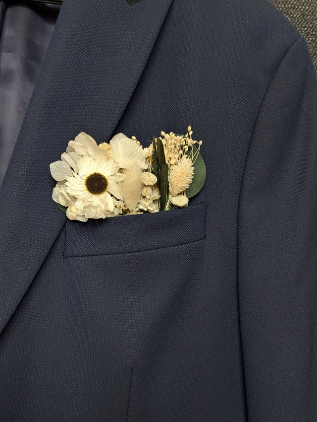 Ajoutez une touche d'élégance intemporelle à la tenue du marié avec cette pochette boutonnière en fleurs séchées et stabilisées. Spécialement conçue pour les costumes, cette pièce unique marie la beauté naturelle des fleurs avec la durabilité pour un souvenir éternel de VOTRE journée spéciale.