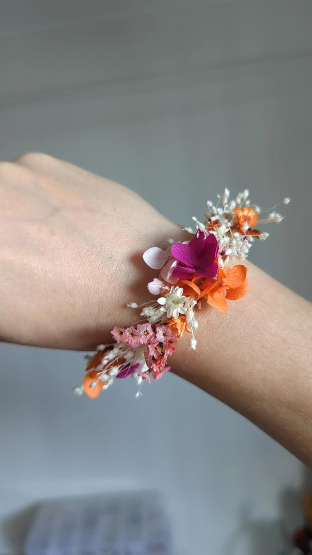 Chaque bracelet est entièrement réalisé à la main, avec soin, dans notre atelier de la Loire. Les compositions florales sont toutes uniques, dans un esprit bohème chic.