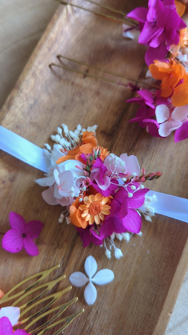 Il se noue facilement autour du poignet dont la couleur est au choix (blanc, crème, rose pale, etc). Un petit bijou floral à nouer au poignet pour une cérémonie pleine de lumière, de douceur et de couleurs d’été. 🌞