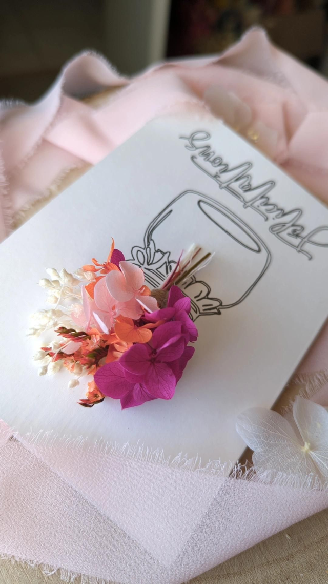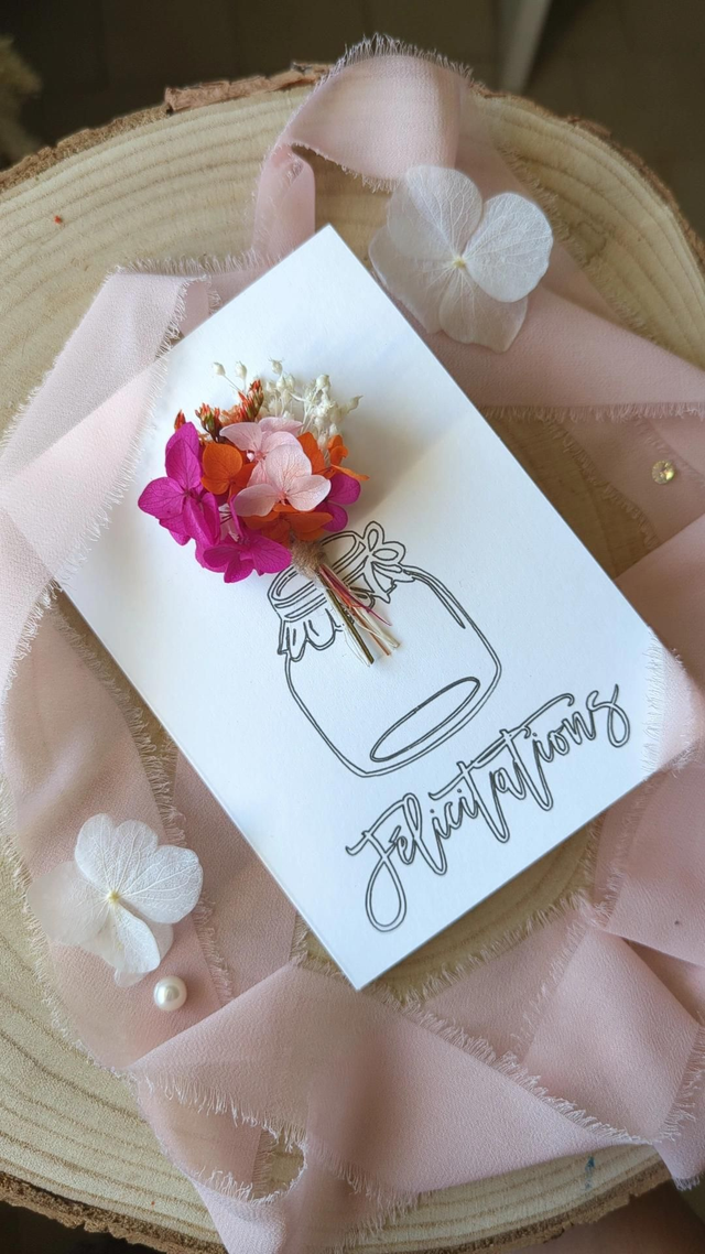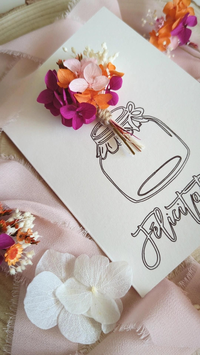 Fleurs séchées et stabilisées dans un petit pot dessiné - Format A6 double page en papier cartonné blanc