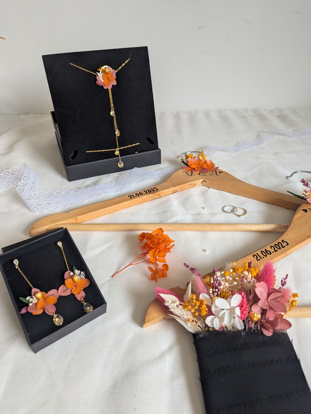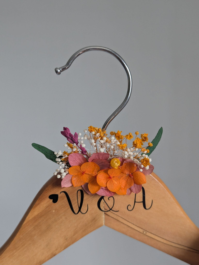 Ajoutez une touche unique et poétique à votre jour J avec un cintre fleuri personnalisé. Idéal pour suspendre la robe de la mariée, le costume du marié ou les tenues des témoins et demoiselles d'honneur.