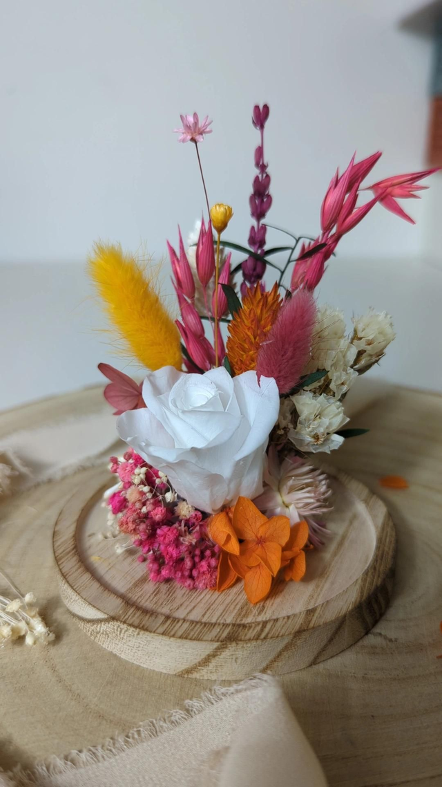 Plongez dans la magie d’un petit monde suspendu : une rose éternelle, accompagnée de fleurs séchées et stabilisées, délicatement installée sous cloche en verre sur socle bois. Chaque création est faite main, offrant un rendu poétique et raffiné à poser dans un intérieur ou sur une table.