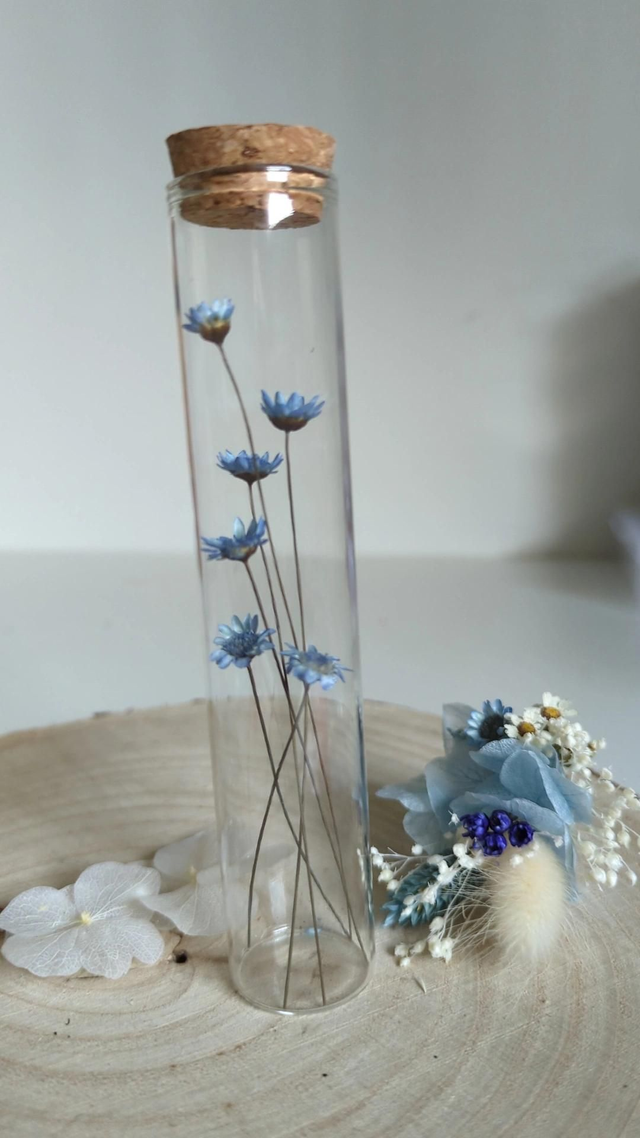 🌸 Une fiole en verre remplie de fleurs séchées, à personnaliser avec une inscription écrite sur le verre : prénom, mot doux, date…