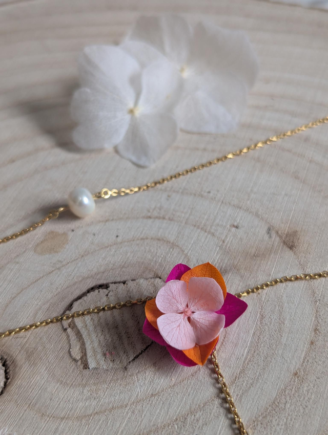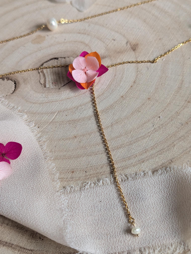 Collier de dos fleuri – Hortensia & perle d'eau douce