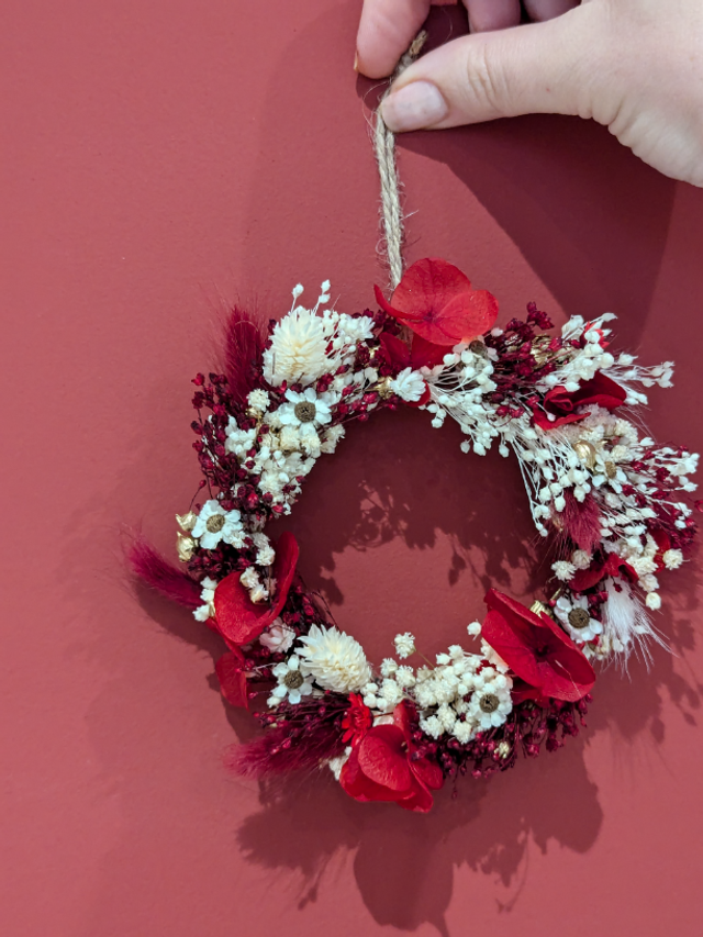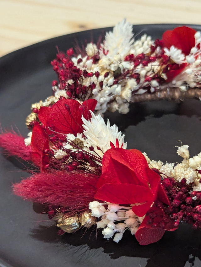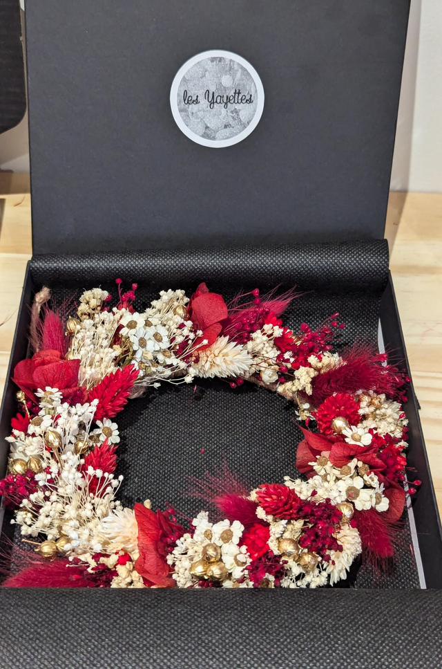 Ces couronnes fleuries sont de véritables incontournables pour les fêtes. Confectionnées à la main avec des fleurs séchées et stabilisées, elles peuvent être suspendues au sapin, accrochées à une porte ou utilisées en centre de table pour sublimer vos repas de fête.