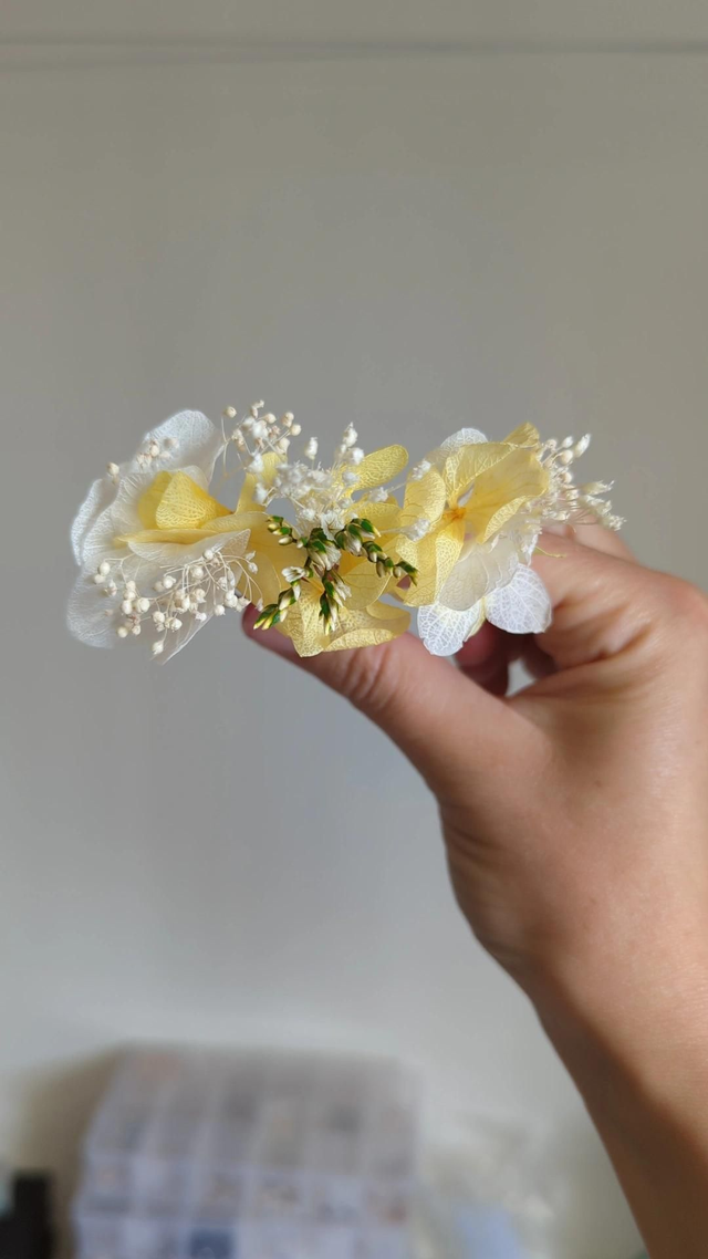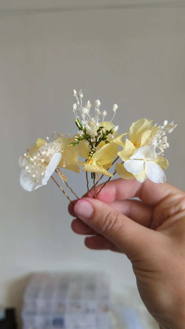 En lot de 3, 6 ou 10, elles permettent de créer un rendu discret ou plus travaillé : parsemées dans une tresse, rapprochées sur un chignon ou alignées en demi-couronne. Chaque épingle est ornée de fleurs séchées et stabilisées, pour une coiffure élégante et personnalisée