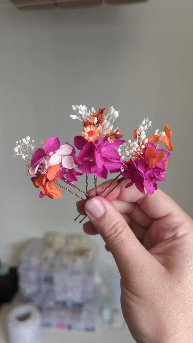 En lot de 3, 6 ou 10, elles permettent de créer un rendu discret ou plus travaillé : parsemées dans une tresse, rapprochées sur un chignon ou alignées en demi-couronne. Chaque épingle est ornée de fleurs séchées et stabilisées, pour une coiffure élégante et personnalisée