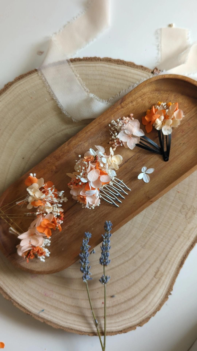 En lot de 3, 6 ou 10, elles permettent de créer un rendu discret ou plus travaillé : parsemées dans une tresse, rapprochées sur un chignon ou alignées en demi-couronne. Chaque épingle est ornée de fleurs séchées et stabilisées, pour une coiffure élégante et personnalisée