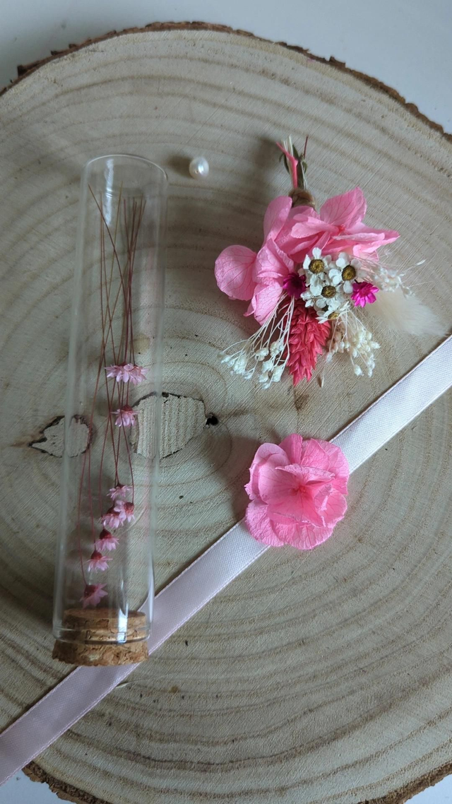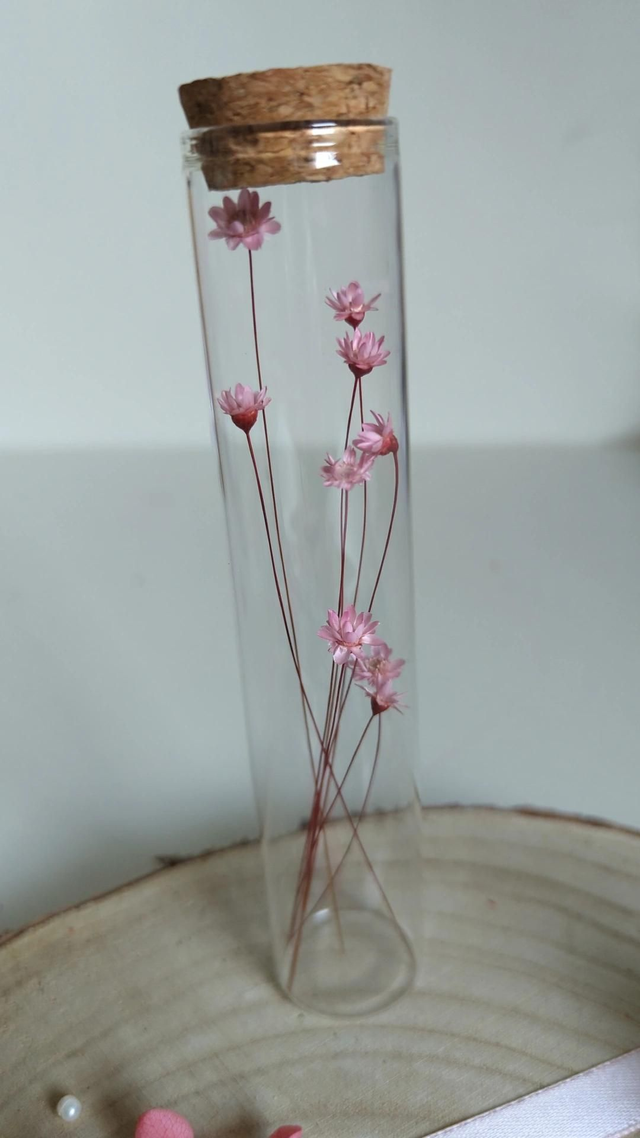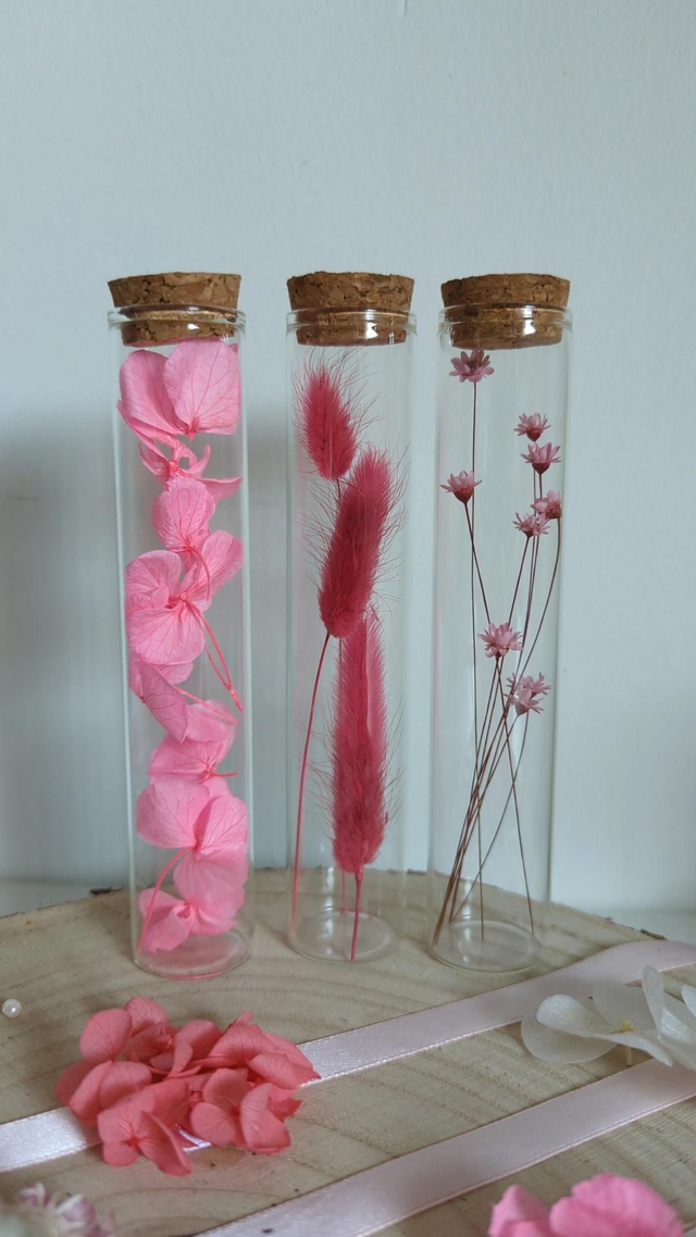 Ces petites fioles en verre, garnies de fleurs séchées rose, sont pensées comme de jolies messagères.