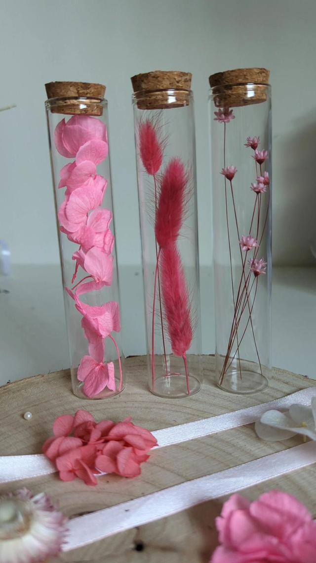 Ces petites fioles en verre, garnies de fleurs séchées rose, sont pensées comme de jolies messagères.