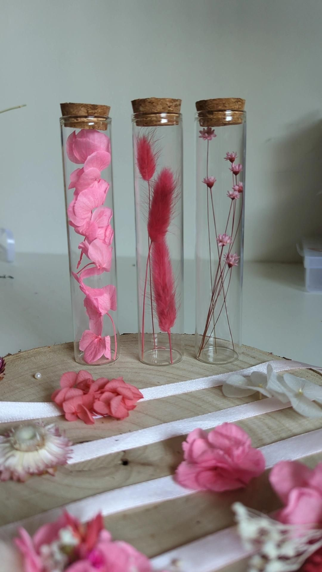 Ces petites fioles en verre, garnies de fleurs séchées rose, sont pensées comme de jolies messagères.