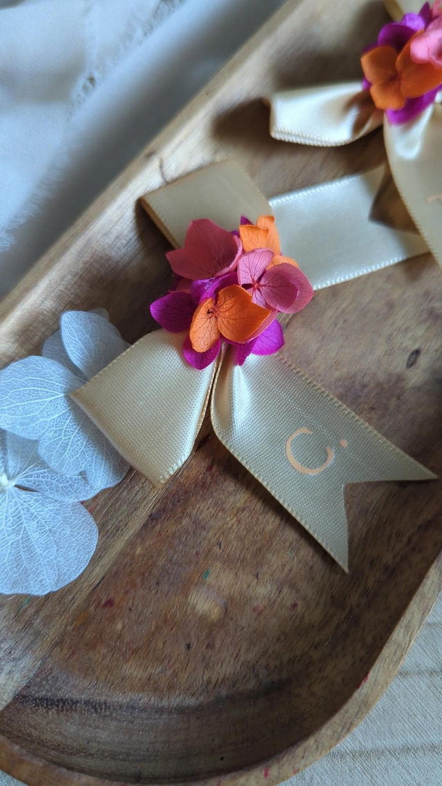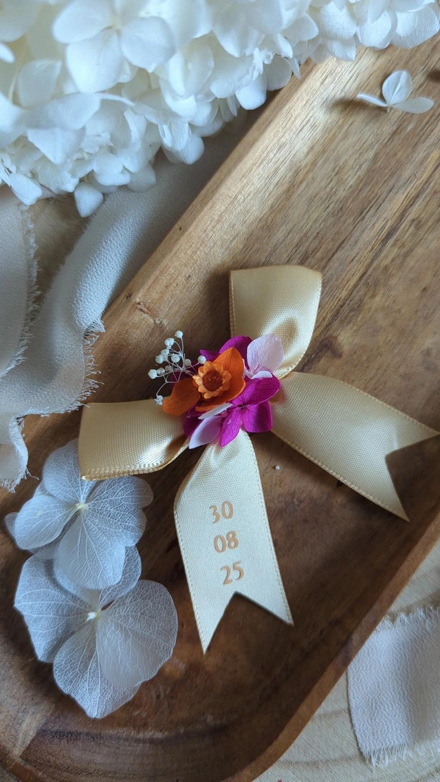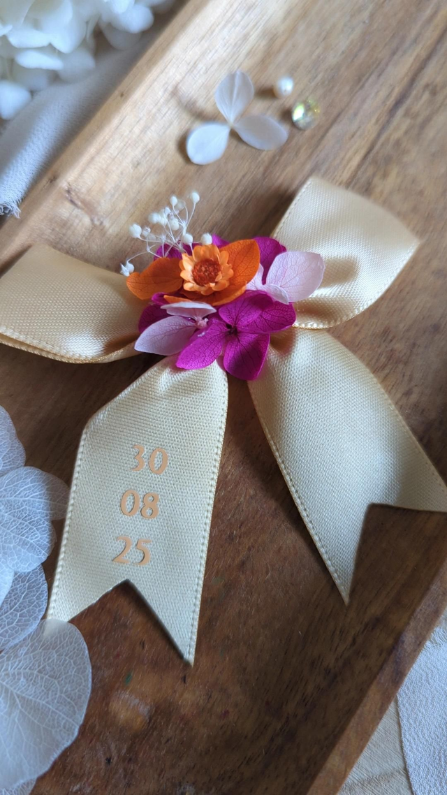 Un petit nœud élégant, en matière satinée, orné de fleurs séchées et stabilisées pour apporter une touche raffinée et unique à votre événement.