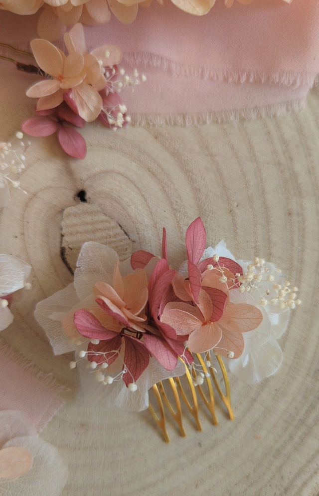 Parfait pour une mariée ou un cortège, il apporte une touche florale unique à un chignon, une tresse ou des cheveux lâchés. Chaque pièce est réalisée à la main avec des fleurs séchées et stabilisées aux couleurs pastels.