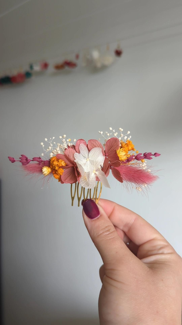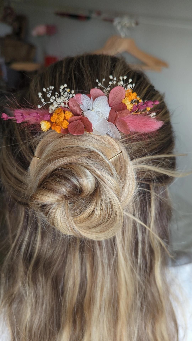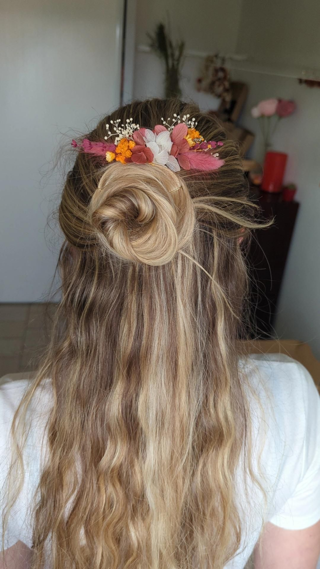 Parfait pour une mariée audacieuse ou un cortège festif, il apporte une touche florale unique à un chignon, une tresse ou des cheveux lâchés. Chaque pièce est réalisée à la main avec des fleurs séchées et stabilisées aux couleurs éclatantes.