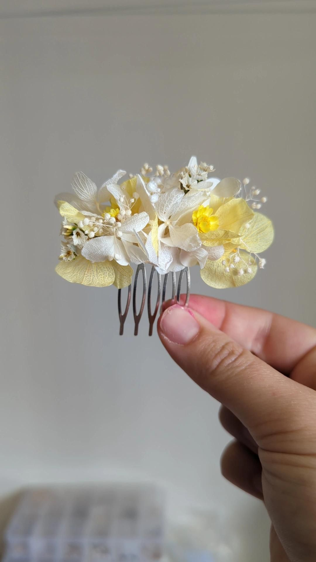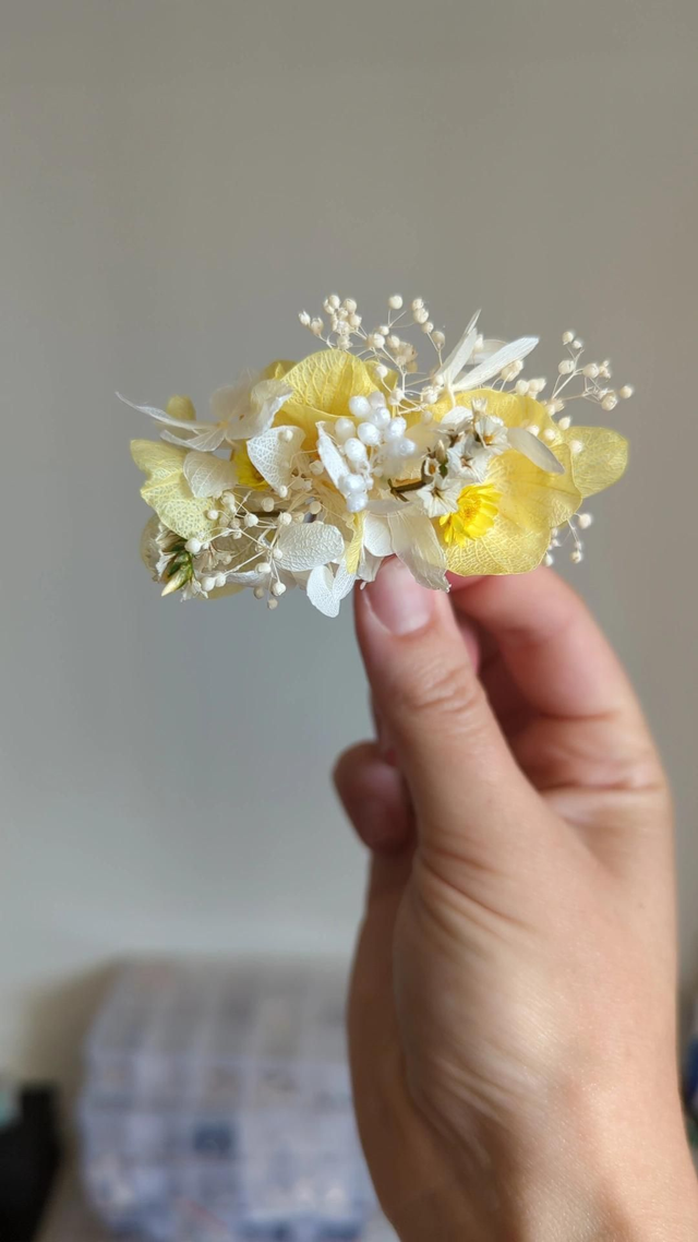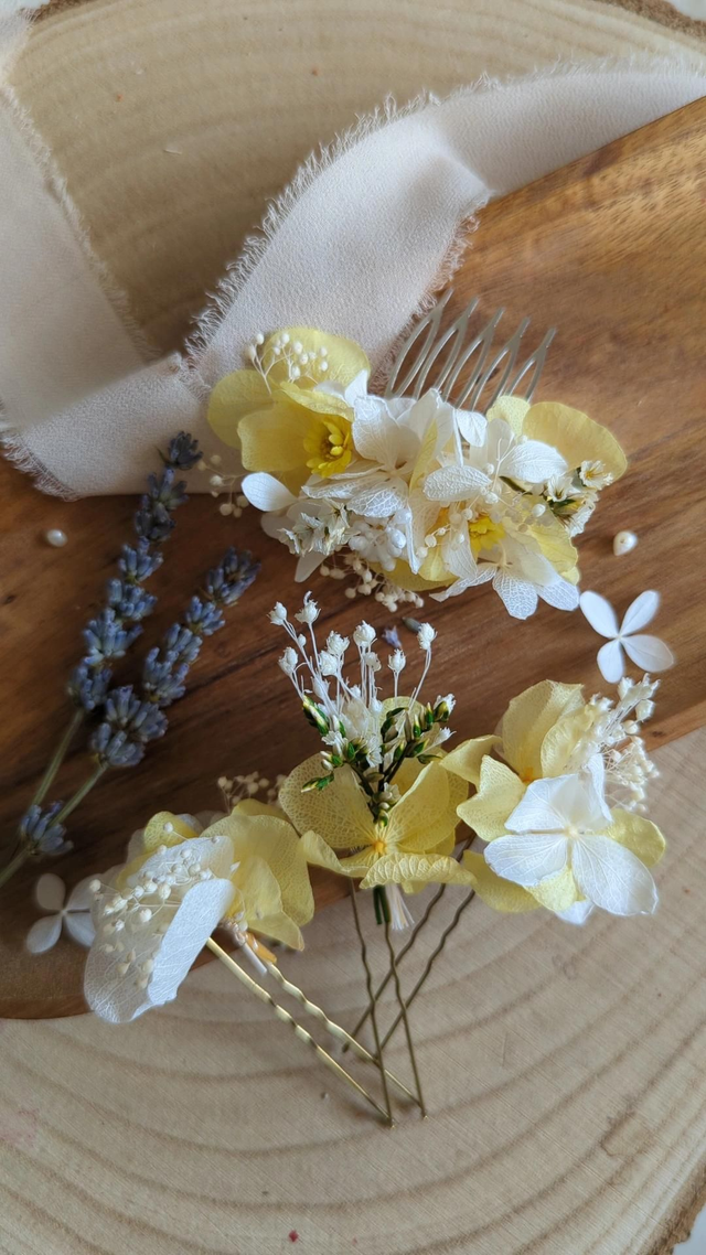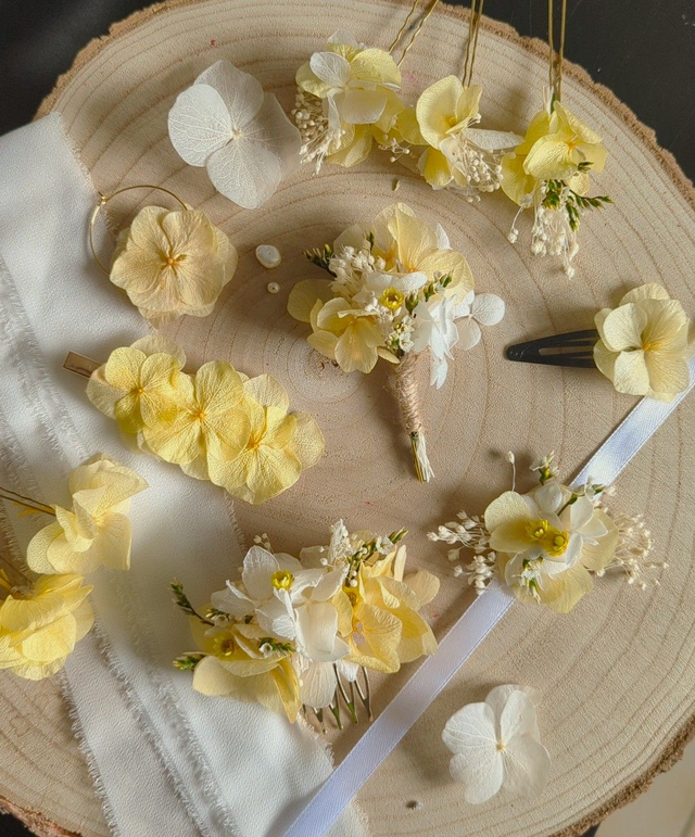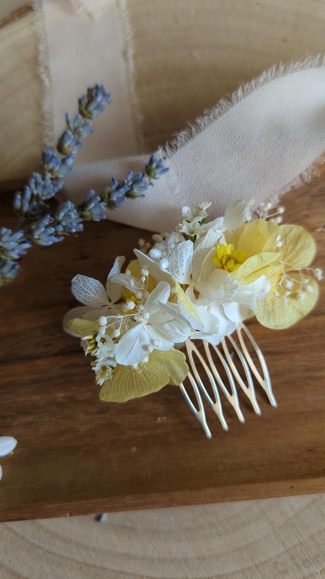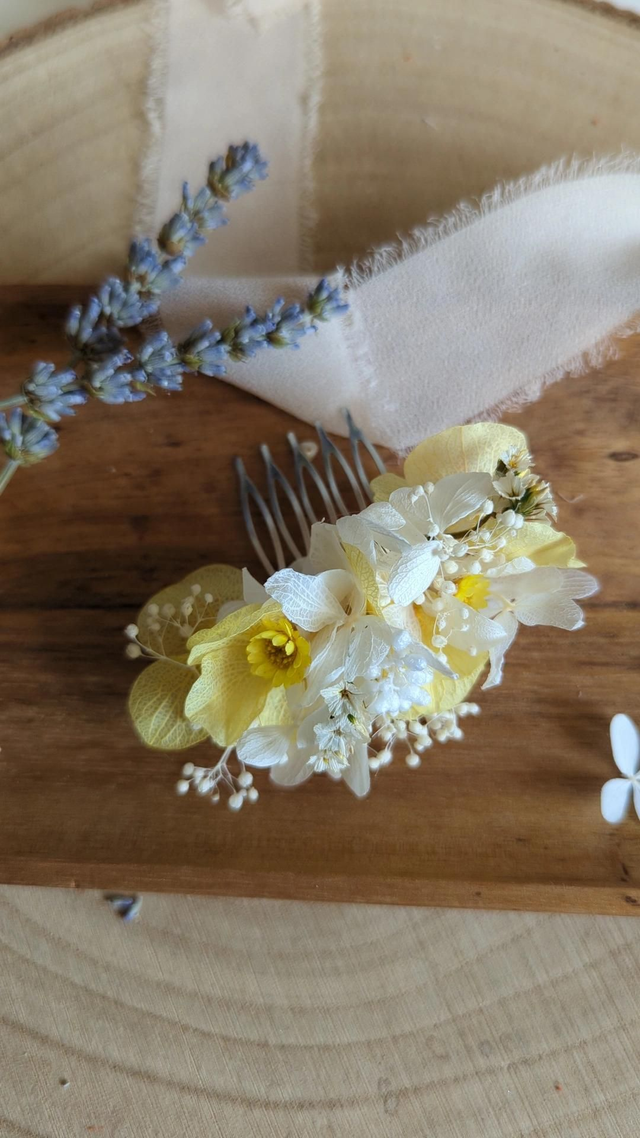 Parfait pour une mariée audacieuse ou un cortège festif, il apporte une touche florale unique à un chignon, une tresse ou des cheveux lâchés. Chaque pièce est réalisée à la main avec des fleurs séchées et stabilisées aux couleurs soleil et blanc.
