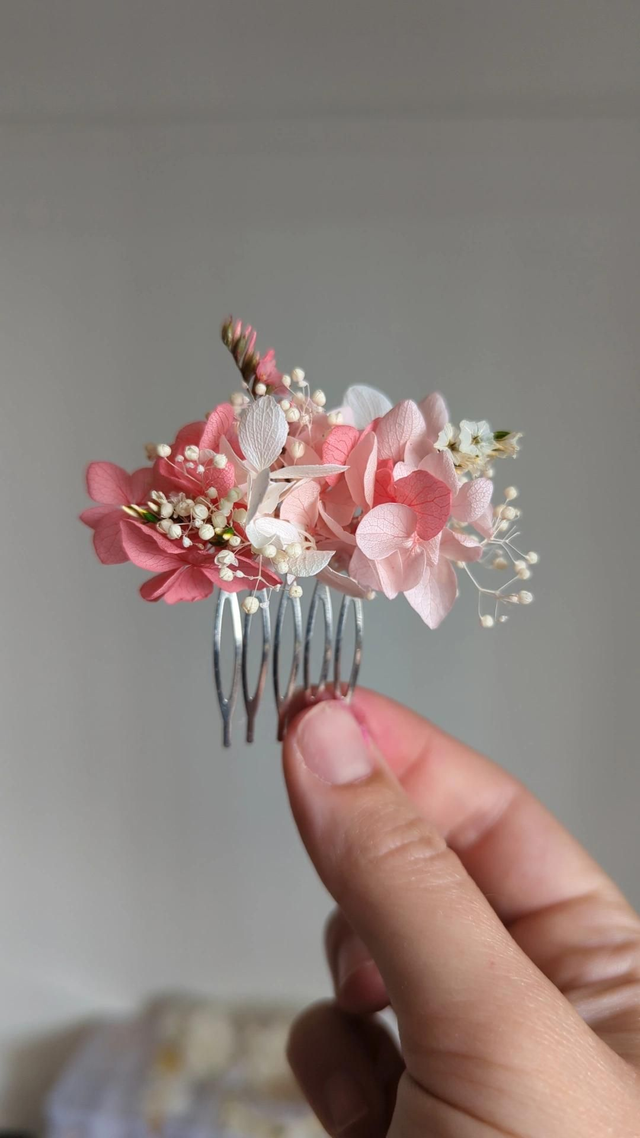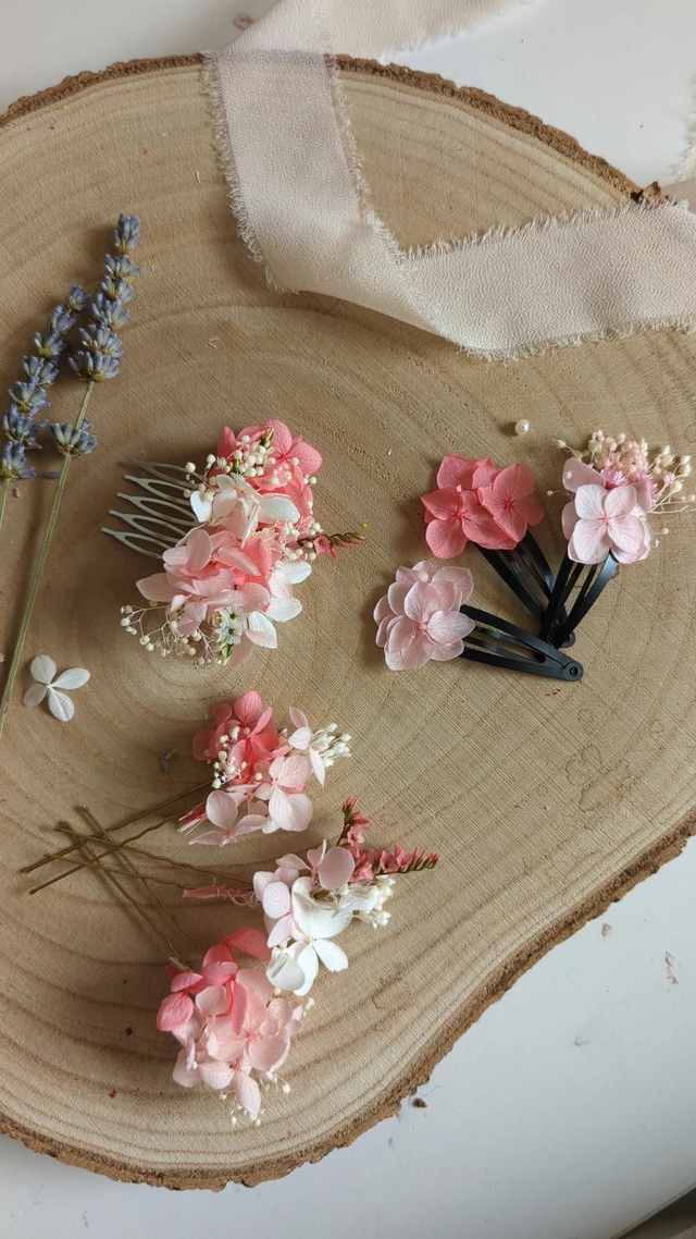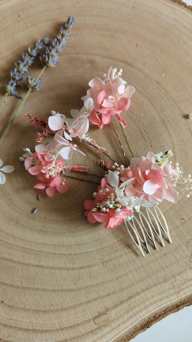 Parfait pour une mariée ou un cortège, il apporte une touche florale unique à un chignon, une tresse ou des cheveux lâchés. Chaque pièce est réalisée à la main avec des fleurs séchées et stabilisées aux couleurs roses.
