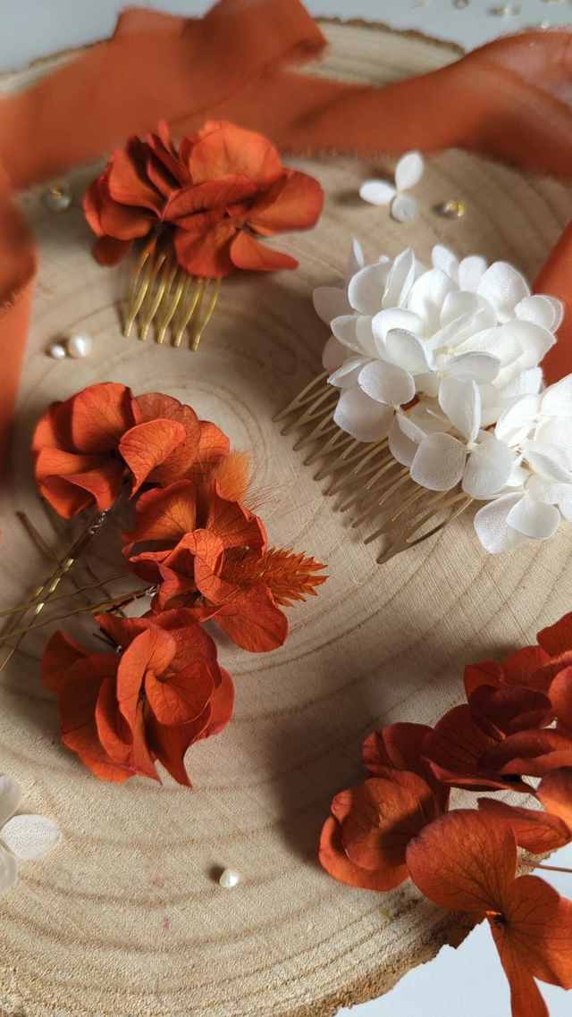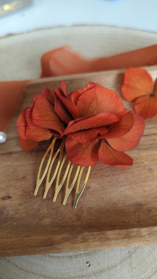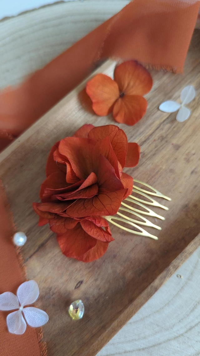 Découvrez le Peigne Terracotta Bloom, un accessoire élégant et naturel pour mariage. Ce peigne artisanal est orné de fleurs d’hortensia séchées aux teintes terracotta chaleureuses, parfait pour sublimer un chignon ou une coiffure bohème. Idéal pour les mariées et invitées qui recherchent un bijou de cheveux original, chic et romantique. Livraison rapide et fabrication française.